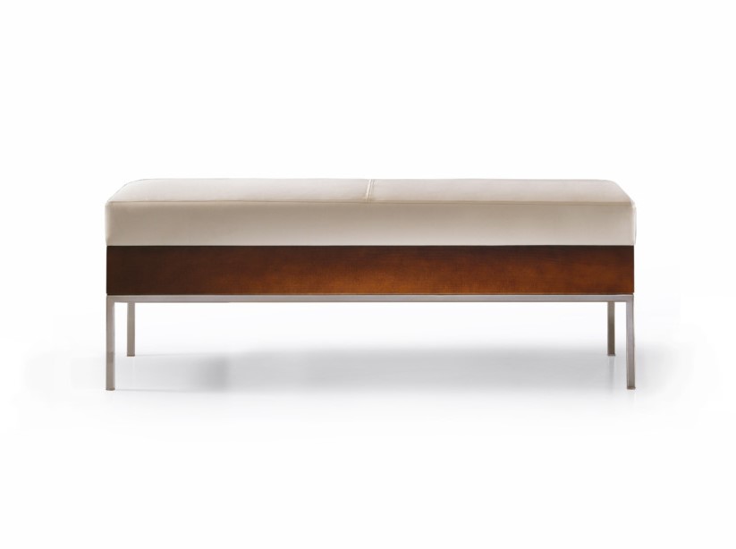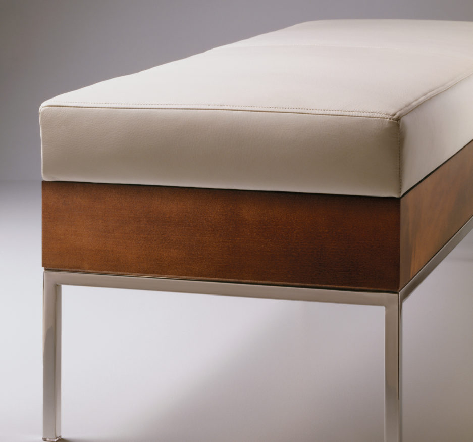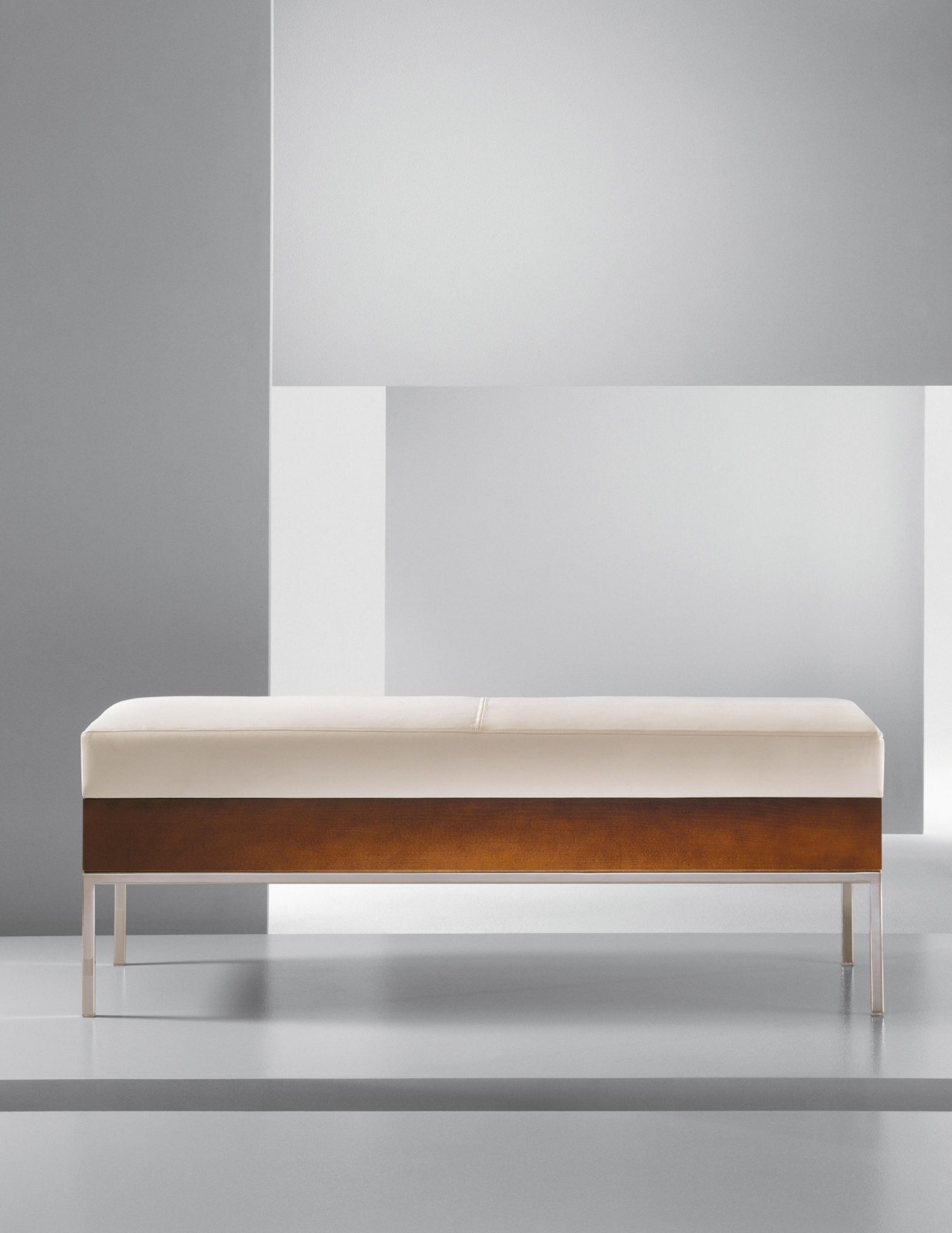 El banco Alia debe su aspecto llamativo como se equilibran visualmente los tres elementos exquisitos que lo componen: base de acero, marco de madera y tapicería en ecocuero de primera calidad.