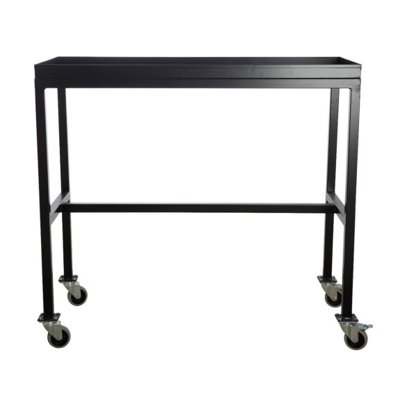 La mesa rodante DKM, de aspecto industrial, está hecha de acero estructural negro.