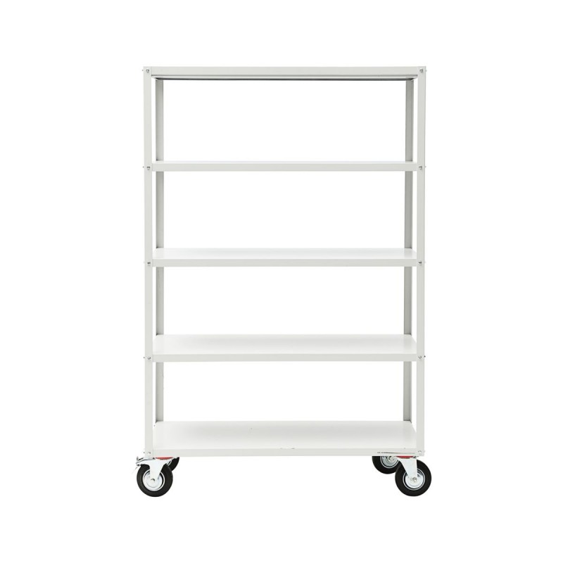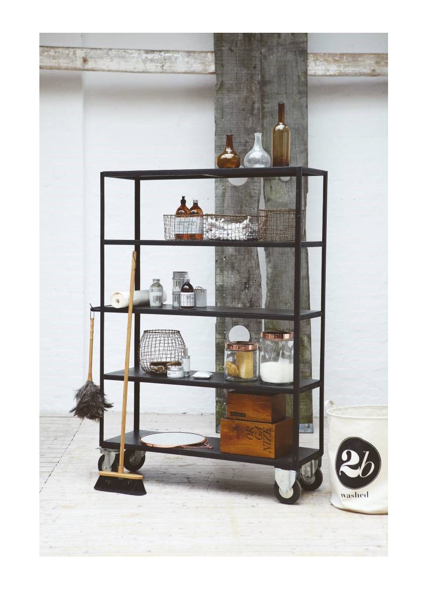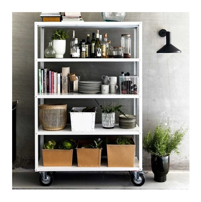 Con estantes y estructura metálica tiene un aspecto industrial vintage.