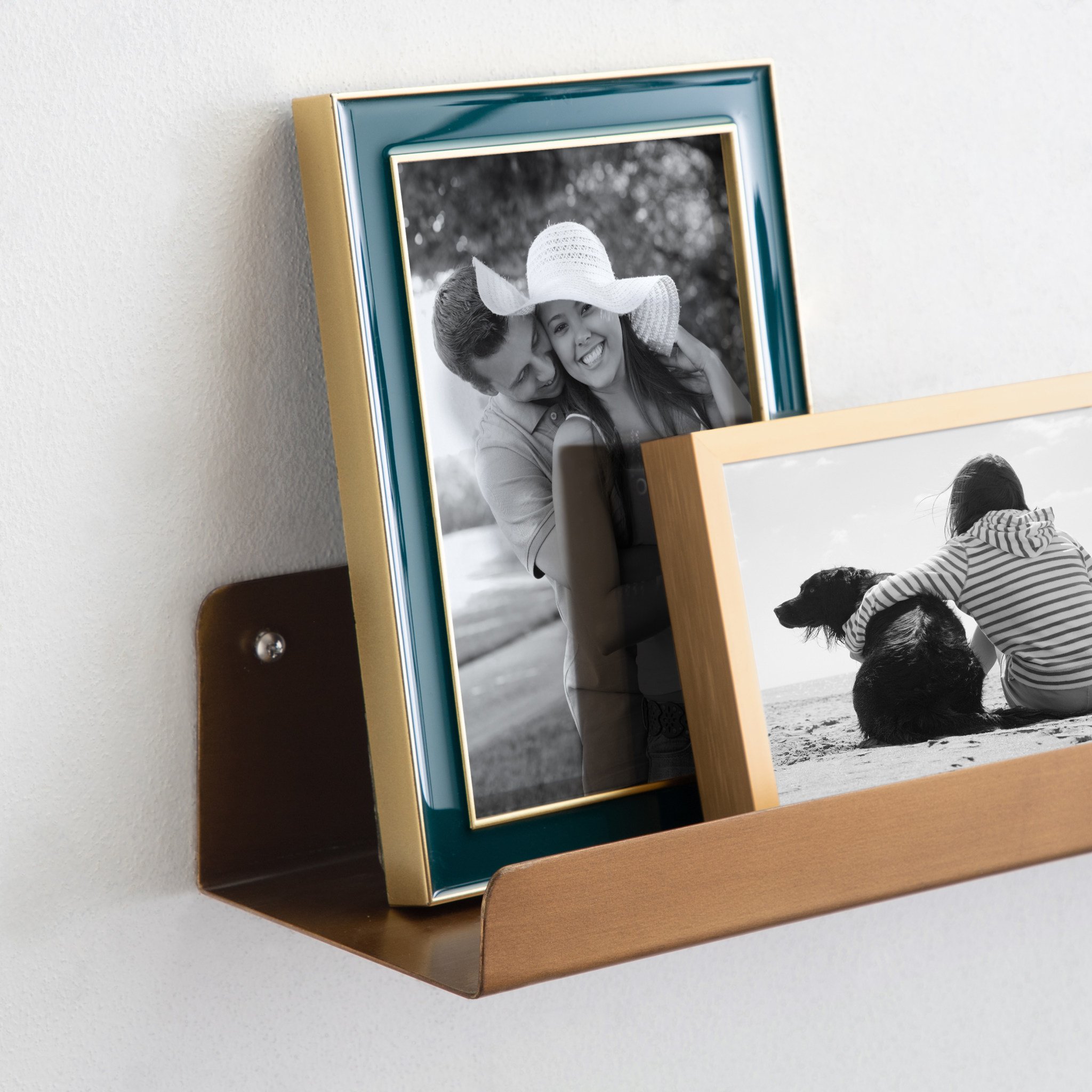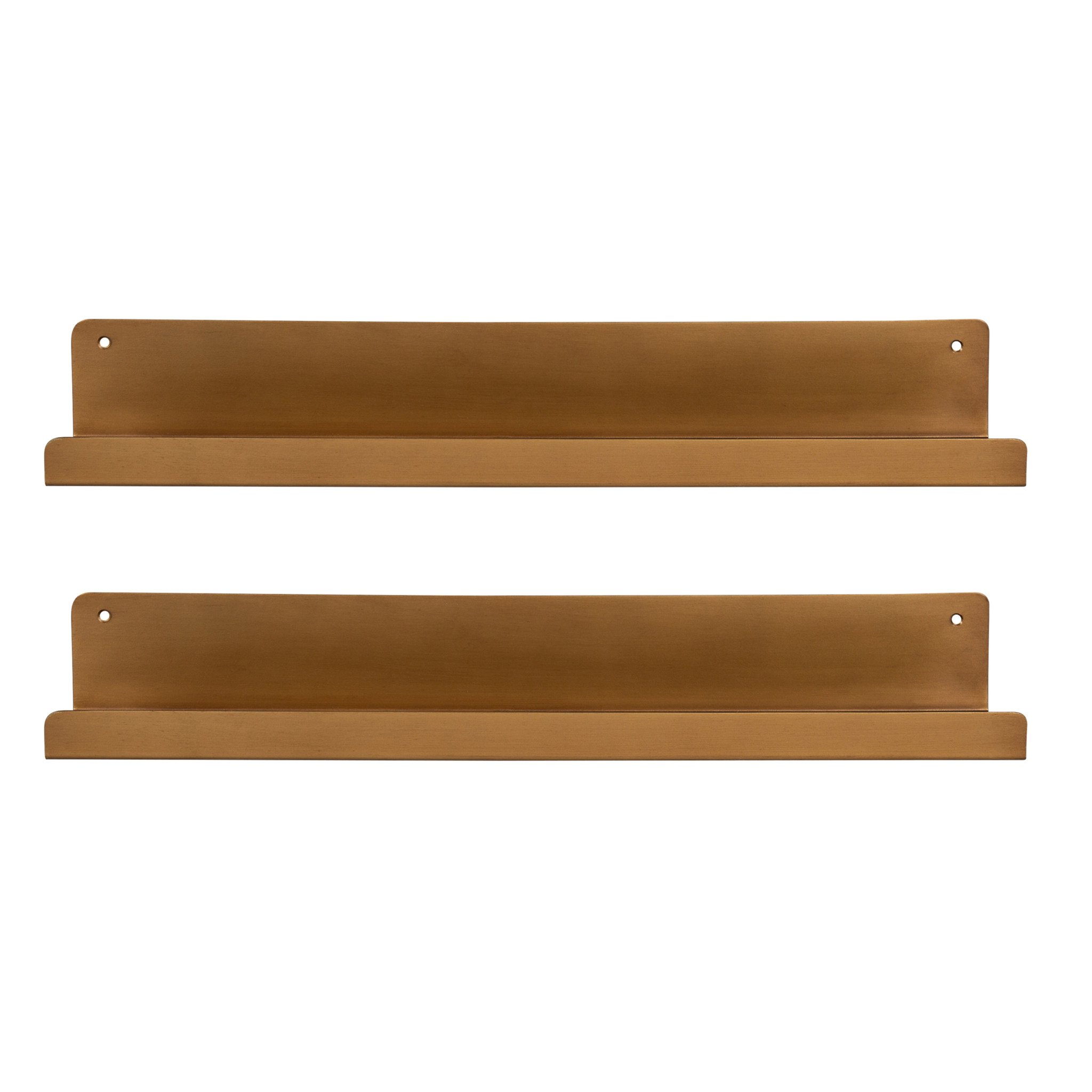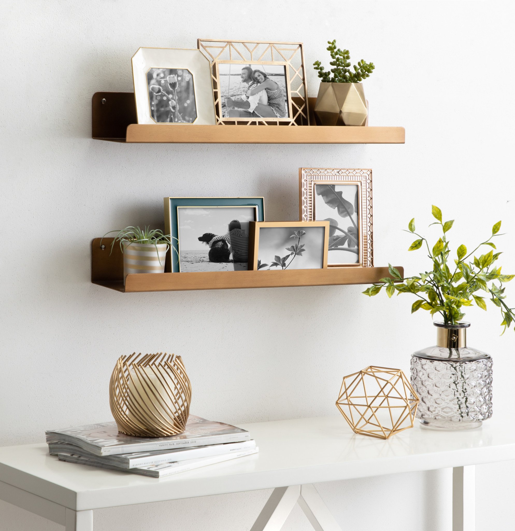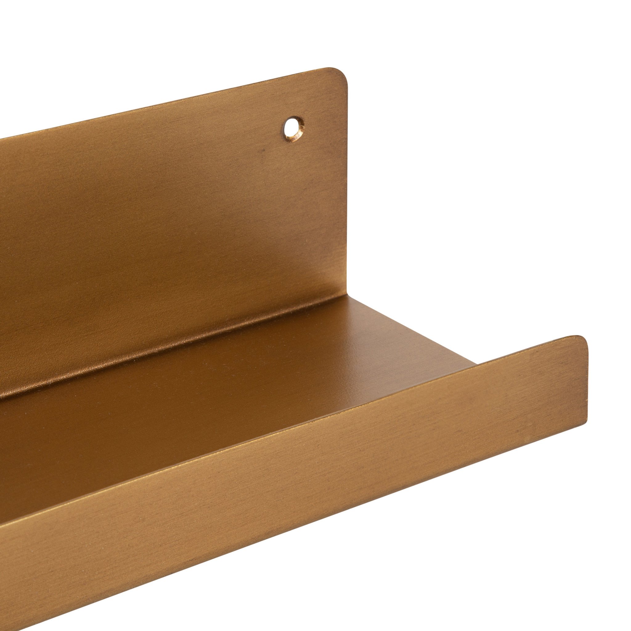 Una solución fácil para la visualización y el almacenamiento. Cada estante tiene una composición metálica resistente con un labio protector para evitar caídas accidentales. El acabado dorado con recubrimiento en polvo también añade resistencia contra el desgaste natural. Monte sus fotos, recuerdos y novedades favoritos en una pieza de exhibición minimalista y arquitectónica.