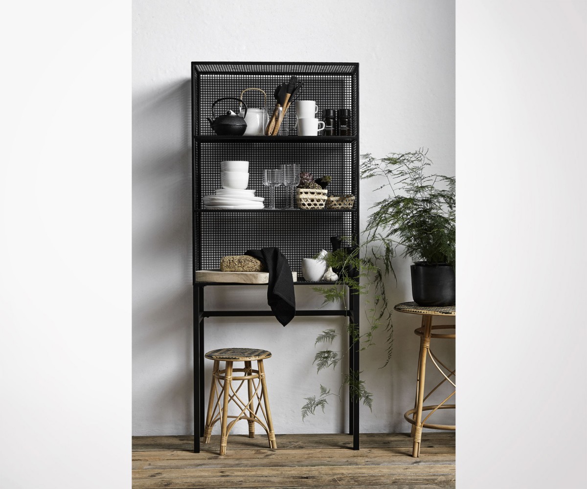 Hermosa estantería de hierro y malla de alambre. Un diseño atemporal y atractivo con muchas aplicaciones.
