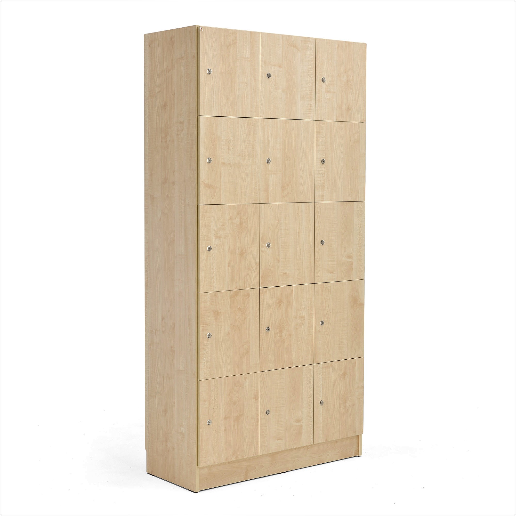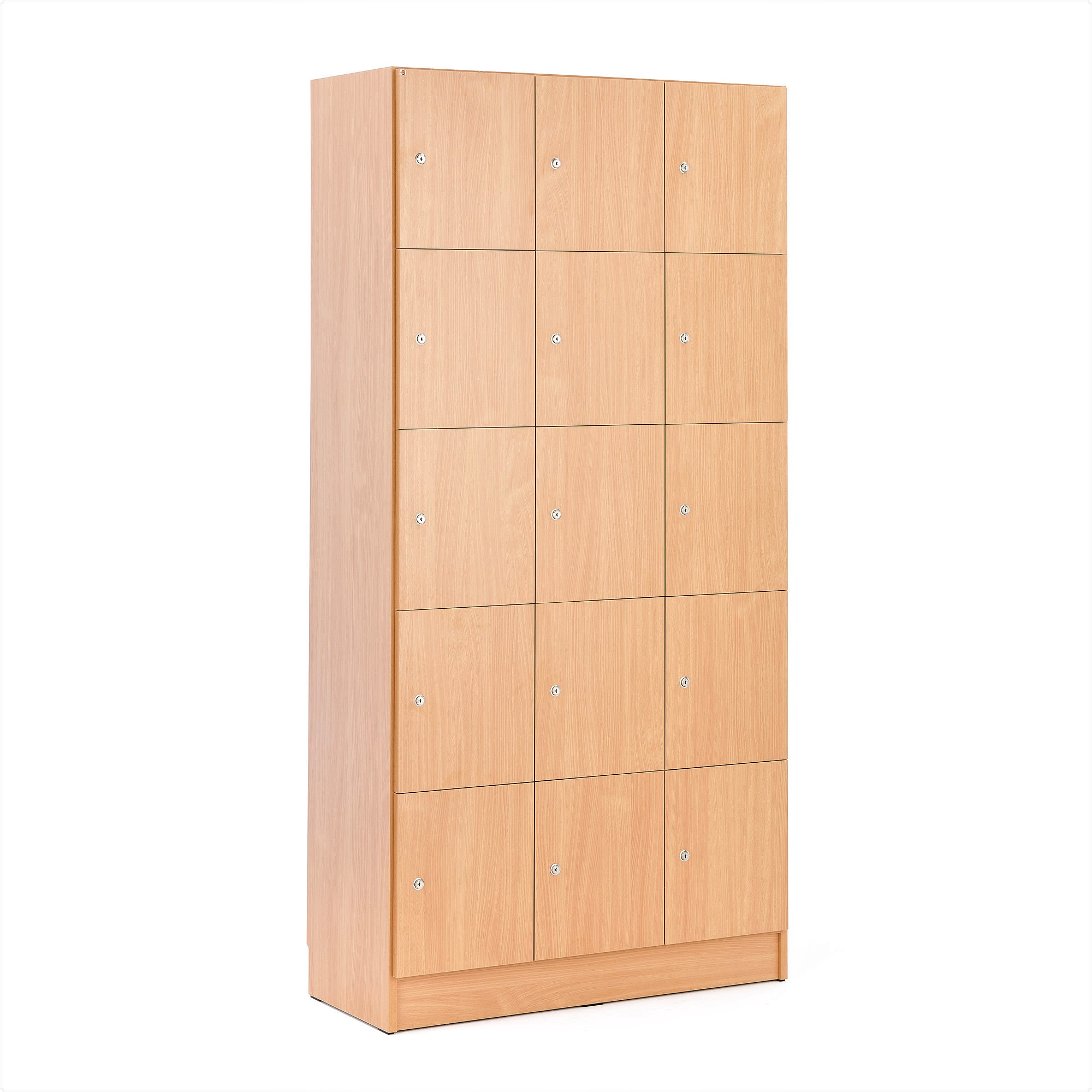 Armario de madera diseñado para guardar objetos personales. El gabinete consta de 3 secciones, cada una con 5 compartimentos con cerradura. Ideal para pasillos, vestuarios o áreas de recepción.